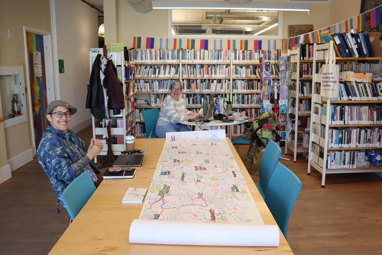 Naty sitting at a long table with Nealob’s beautiful visual notes spread out in front of them. Allison is at a small table in the background.