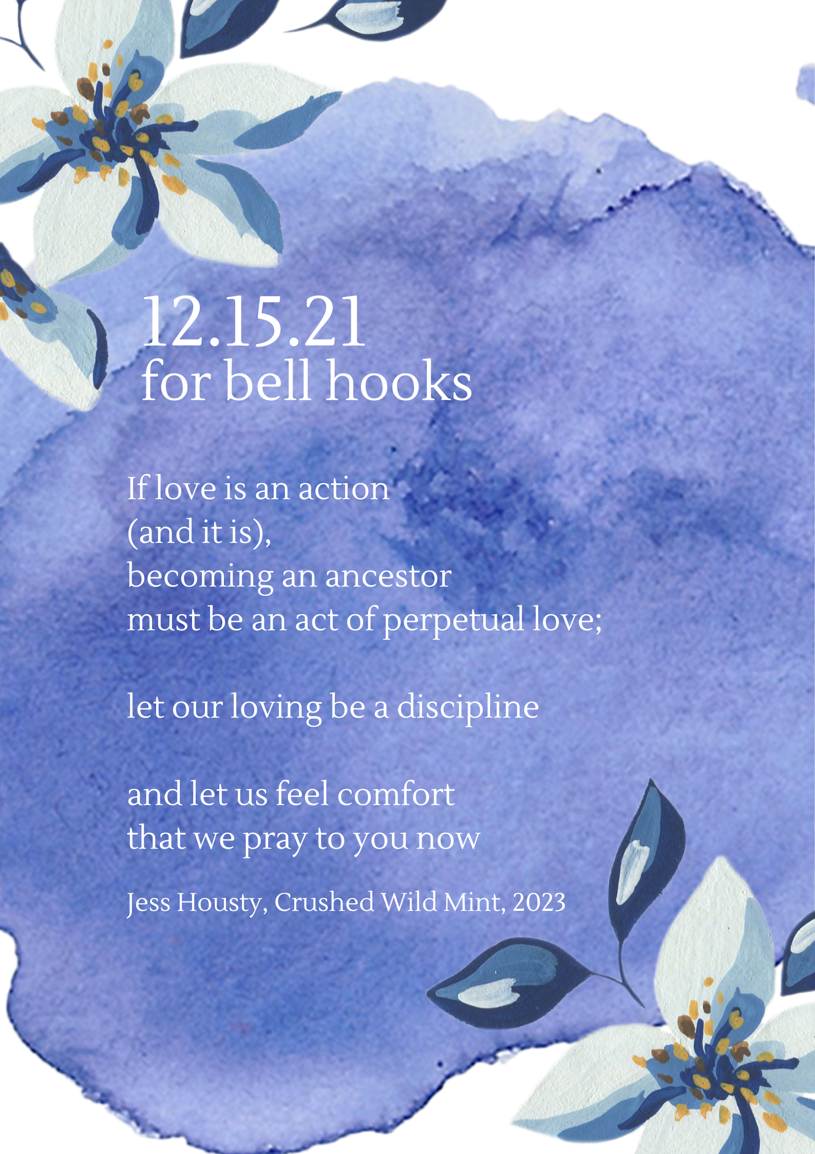 I’ll end our series of correspondence with a poem by Jess Housty (‘Cúagilákv), is a parent, writer and grassroots activist with Heiltsuk and mixed-settler ancestry. They live in their ancestral territory in the community of Bella Bella, BC. The poem is an example of world-building across difference. Jess is writing to bell hooks, expressing their gratitude for bell’s enduring wisdom and love.